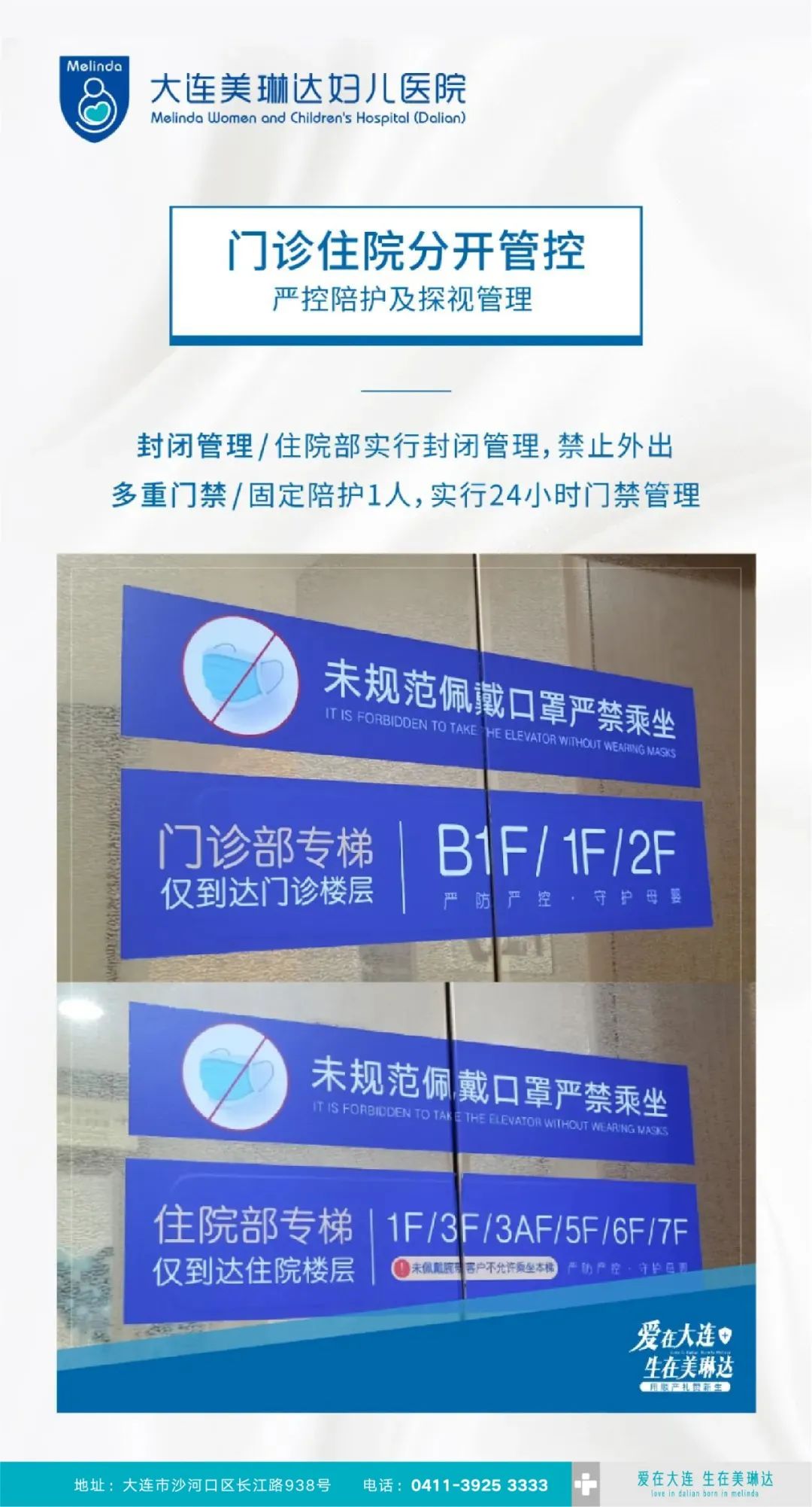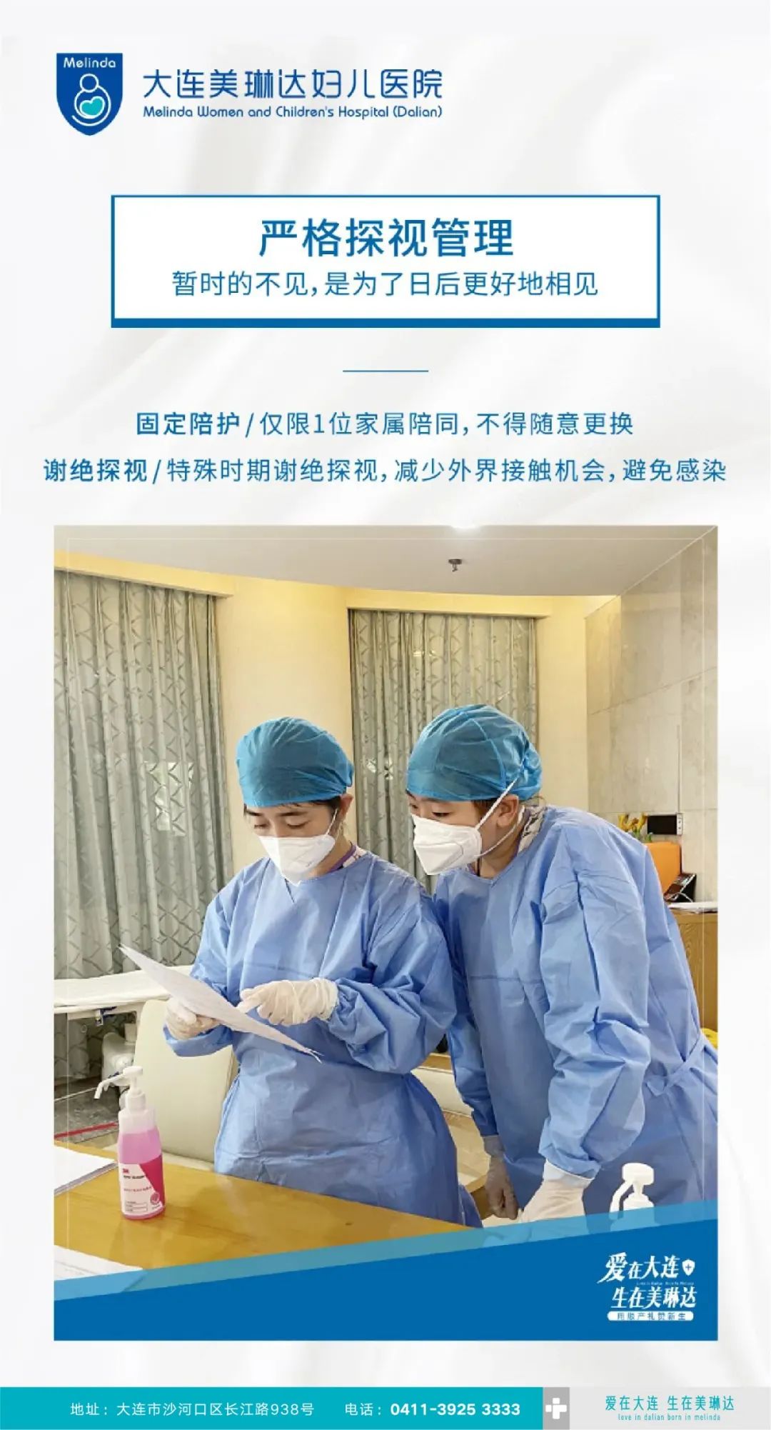 5.医护人员也会对入住客户和陪护人员进行每日监测请配合,如出现发热(腋下体温37.3℃)、乏力、干咳等呼吸道症状,大连美琳达妇儿医院会立即协助转诊至发热门诊,也请理解和配合。